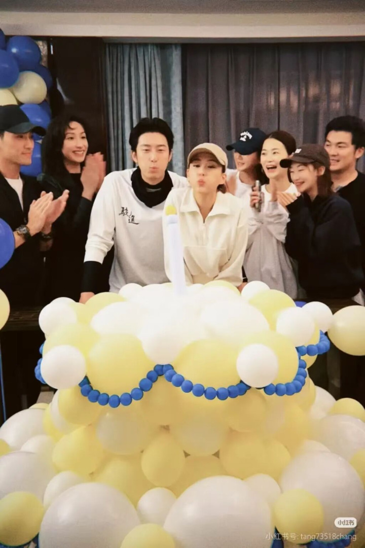 一张照片里,窦骁和何超莲站在由气球组成的蛋糕造型前,一同做出吹蜡烛的动作,身旁的友人们纷纷鼓掌,很是热闹。
