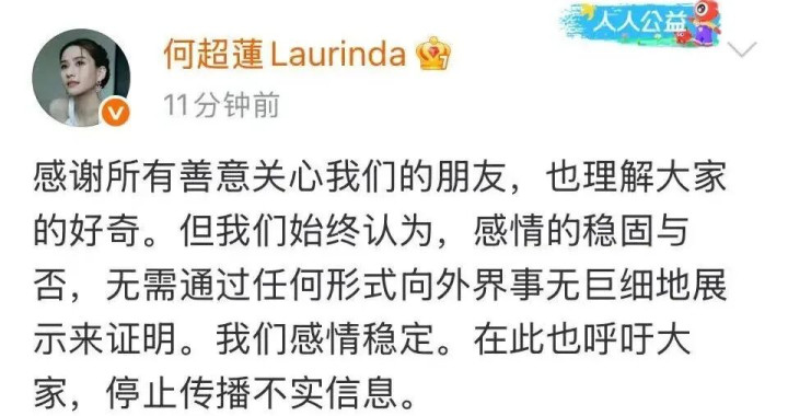 何超莲则称:“我们始终认为,感情的稳固与否,无需通过任何形式向外界事无巨细地展示来证明。我们感情稳定。在此也呼吁大家,停止传播不实信息。”