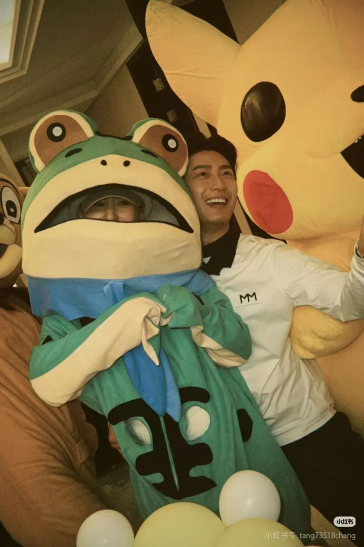 另一张照片中,窦骁紧挨着一个青蛙人偶,笑容灿烂。仔细一看,人偶里露出的正是何超莲的脸。